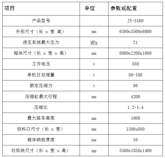 JY-3160 水平式四柱舉升垃圾壓縮設(shè)備是我公司根據(jù)國(guó)內(nèi)環(huán)衛(wèi)設(shè)備的具體情況,借鑒國(guó)內(nèi)外垃圾處理的先進(jìn)技術(shù)和工藝而研制開發(fā)的產(chǎn)品,主要用于對(duì)城區(qū)內(nèi)小區(qū)、居民點(diǎn)、廠礦和機(jī)關(guān)院校的生活垃圾以及固體廢棄物的收集、壓縮減容和封閉轉(zhuǎn)運(yùn)。該產(chǎn)品在垃圾壓縮、垃圾塊寄存、垃圾塊裝車等方面具有獨(dú)特優(yōu)點(diǎn)和創(chuàng)意,是目前國(guó)內(nèi)垃...